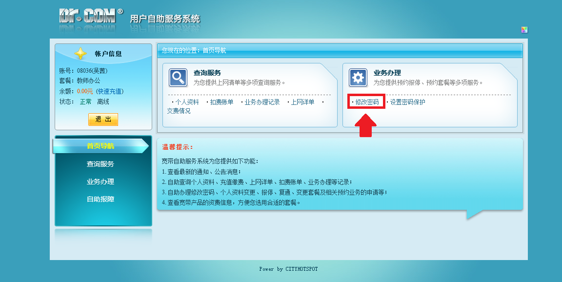 2. 进入首页,会看见个人的上网信息,选择修改密码的功能,如图2所示箭头指向处。