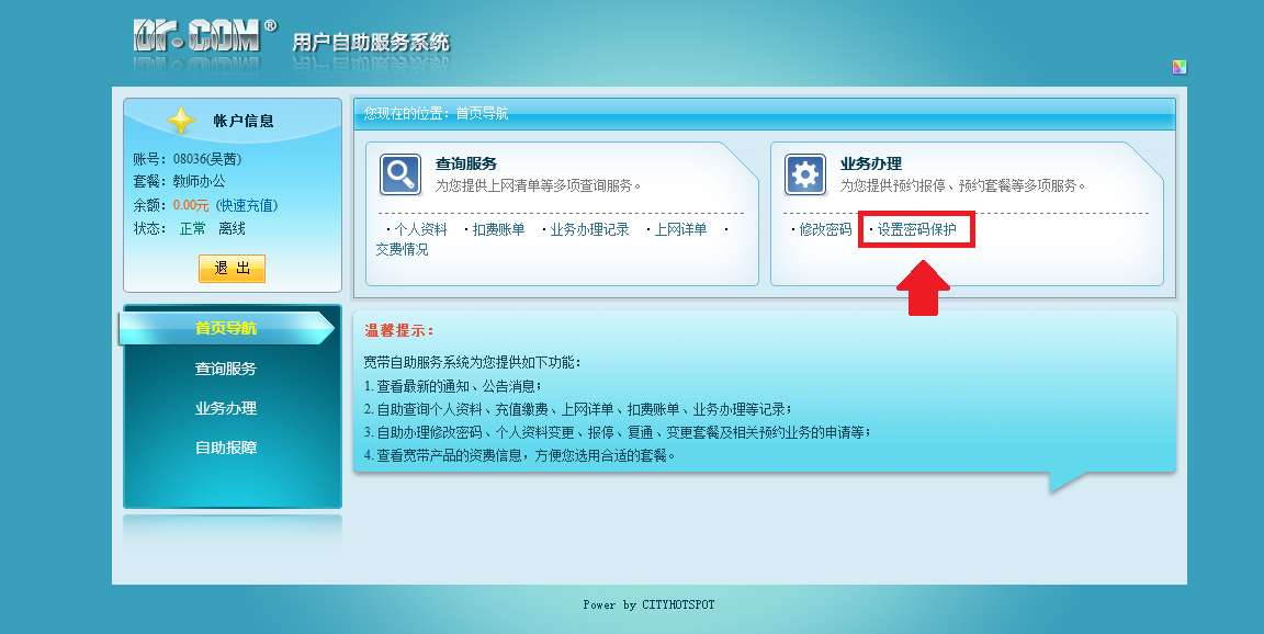 1. 登录“用户自主服务系统”,进入自主服务首页面,网址为:http://218.194.224.27:8080/Self 。