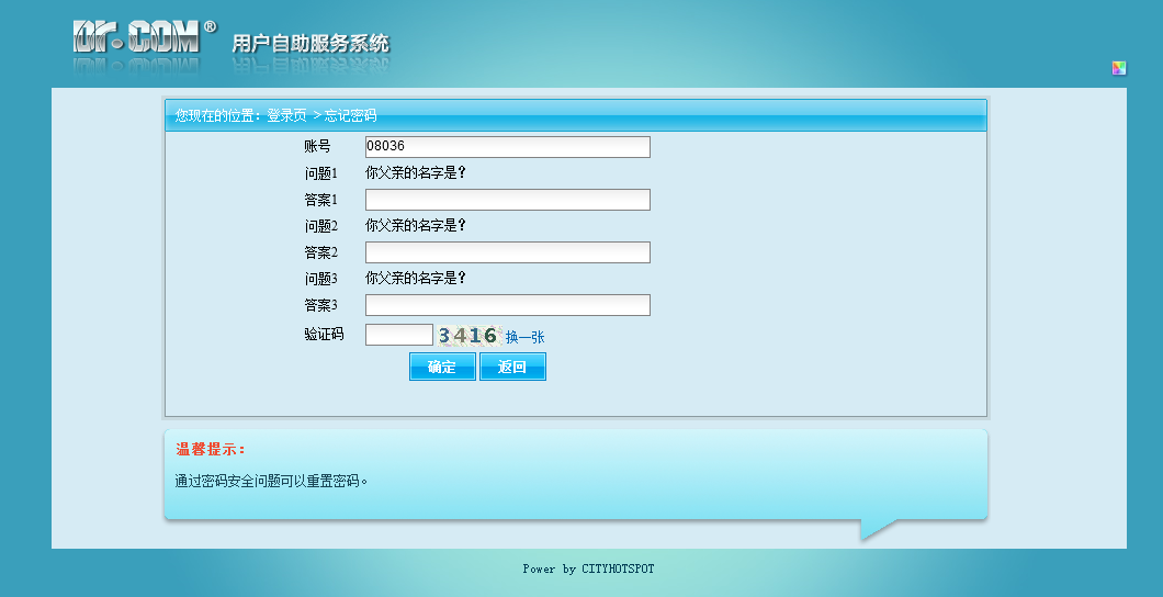 3. 进入忘记密码界面,通过回答设置的三个密保问题,输入新的密码,即可修改密码成功,如图2所示。